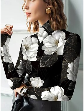 Női Póló Virágos Grafika Növények Elegáns Szüret Stílusos Hosszú ujj Körgallér Magasnyakú Normál felsők Alkalmi Fekete Arcpír rózsaszín Ősz Tél