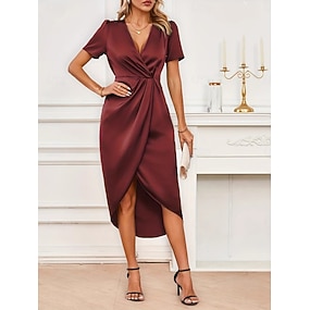 Női Midi ruha Szatén ruha Party ruha Koktélruha Elegáns Divat Romantikus Parti Esküvő Esküvői vendég Normál Sima Rövid ujjú V-alakú Fekete Pezsgő Bor Lóhere Nyár