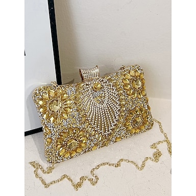 elegáns arany csillogó estélyi kuplung - női parti kézitáska láncpánttal és dekoratív fém díszítéssel esküvőkre és hivatalos rendezvényekre