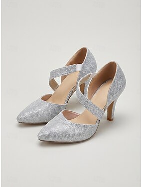 1980-as évekbeli, elegáns, fémes ezüst t-pántos női sarok hegyes orrral és csatos részletekkel – tökéletes esti bulikhoz vagy hivatalos eseményekhez