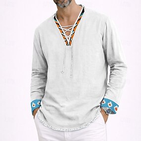 Férfi Ing Vászon ing Viking stílus Popover ing Nyári póló Stranding Tömör szín Vakáció Szabadság Medence Fekete Fehér Hosszú ujj V-alakú Nyár Tavasz Ruházat Zsinór