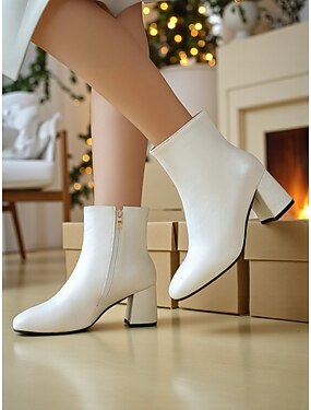 női fehér műbőr bokacsizma műszőrme mandzsettával és csattal, elegáns magas sarok, tökéletes télire, karácsonyi partikra és ünnepi alkalmakra