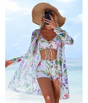 Női Bikini 3 Részes Fürdőruha Rövidnadrág Slim Háttérkivágás Üdülő Tengerparti Ruha Virágos Grafika V Nyakú Ujjatlan Hosszú Ujjú Fürdőruha