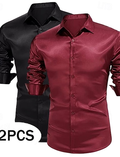 Férfi Szatén ing Ing Galléros ing Gombos póló Báli póló Sima Esküvő Parti Fekete Fehér Rubin Medence Hosszú ujj Térfogatcsökkenés Tavasz, Ősz, Tél, Nyár Ruházat Gomb lefelé
