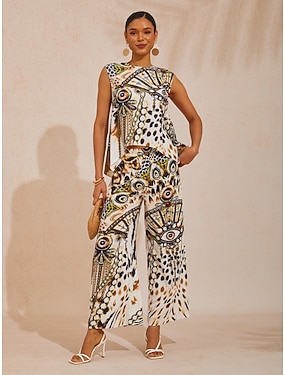 szatén geometrikus virágmintás bő szárú nadrág lezser vakáció