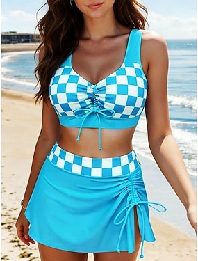 Női Fürdőruha Bikini 2 darab Szoknya Fürdőruha Hasszorító Magas derék Vékony Nyitott hátú Szabadság Szüret Grafika Kockás Kanálnyak Ujjatlan Fürdőruhák