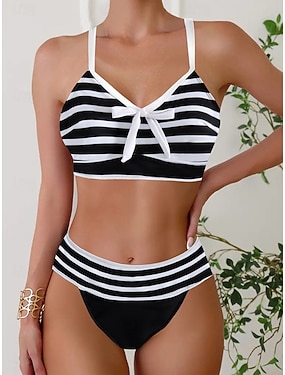 Női bikinis 2 részes fürdőruha kockás vékony hát nélküli vakációs strandruha csíkos V nyakú ujj nélküli fürdőruhához