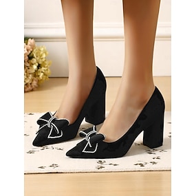 női fekete velúr blokk sarkú, hegyes orrú, strasszos masnival díszített, elegáns és kényelmes alkalmi randevúkra és mindennapi viseletre.