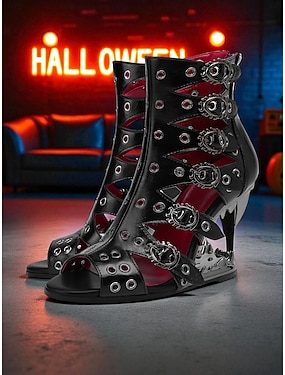 női gótikus, nyitott orrú gladiátor szandál tüskés éksarkúval - fekete punk kivágott cipők halloweenhez, cosplayhez és alternatív divathoz