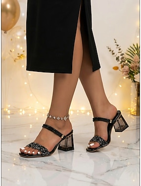 női fekete kristályokkal díszített sarkú szandál - átlátszó blokk sarkú, nyitott orrú cipő koktélpartikra, estélyi viseletre és hivatalos alkalmakra