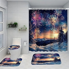 4 darabos zuhanyfüggöny szett WC-ülőkével és fürdőszobai szőnyeggel – karácsonyi beltéri fürdőszobai dekoráció, tűzijáték-domb mintás tájkép, vízálló poliészter anyagból, 12 akasztóval felszerelve