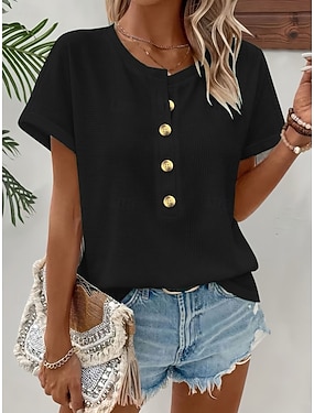 Női Waffle textúrájú kötött felsők T-shirt gombos eleje ombre grafika geometria stílusos klasszikus rövid ujjú kerek nyakú Henley hosszú felsők napi sportra kék fekete és fehér nyár tavasz ősz
