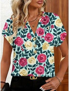 Női Póló Nyomtatott Virágos Grafika Csehország Szüret Alkalmi Rövid ujjú V-alakú Normál felsők Napi Bézs Nyár Tavasz