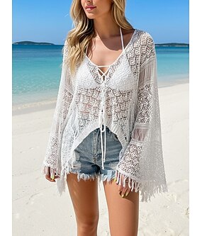 Női Boho ing Csipke ing Tunika Fűzőlyuk felső Zsinór Horgolás Sima Szabadság Strand stílusok Harang V-alakú Napi Utca Fekete Fehér Khakizöld Nyár