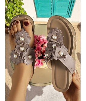 női fehér virágos, gyöngyökkel díszített, ék alakú papucs – bájos, hétköznapi szandálok nyári viseletre és nyaralásra