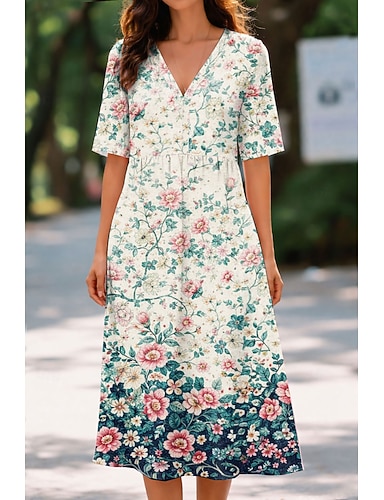 Női Midi ruha Virágos ruha Nyomtatott ruha Divat Modern Szabadtéri Vakáció Alkalmi Laza öltözet Virágos Rövid ujjú V-alakú Medence Világoszöld Katonai zöld Rubin Nyár Tavasz