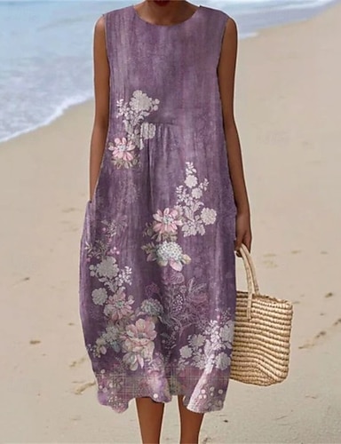 Női Midi ruha Műpamut ágynemű Váltó ruha Nyári ruha hétköznapi ruha Szüret Napi Szabadtéri Vakáció Normál Virágos Ujjatlan Terített nyak Bíbor Nyár Tavasz