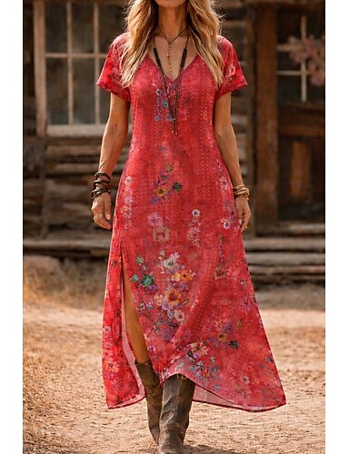 női maxi ruha bohém nyári ruha egy vonalú ruha vakáció hétköznapi bohém tengerparti alkalmi standard szabású virágmintás grafikus rövid ujjú v nyakú narancssárga piros rózsaszín nyár tavasz