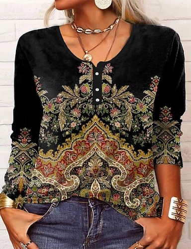 Női póló Hosszú ujjú V nyak Hosszú ujjú tunika Grafika Növények Mandala Elegáns Bohémia Vintage Szokásos Felsők Napi Kimenő Hétvégi Nyomtatás Fekete Tavasz Ősz Tél Előősz