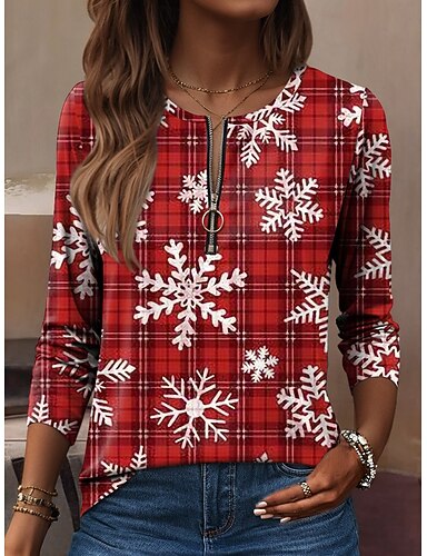 Női Póló Grafika Kockás Hópehely Szüret Divat Stílusos Hosszú ujj Terített nyak Normál felsők Napi Cipzár Nyomtatott Rubin Medence Bíbor Lóhere Tavasz Ősz Tél