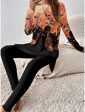 Halloween Női Pizsama Szett Otthoni Ruházat Kerek Nyakú Hosszú Ujjú Kényelmes Divat Nadrág Szett Grafika Nyomtatás Mindennapi Mindennapi Fekete Narancs Normál Fit