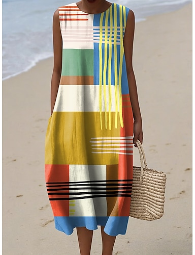 Női Midi Ruha Vászonhoz Hasonló Kifordítható Ruha Hétköznapi Tengerpart Kimenő Laza Illeszkedés Grafikai Geometrikus Ujjatlan Kereknyakú Kék Világos Sárga Sárga Lila Nyár Tavasz