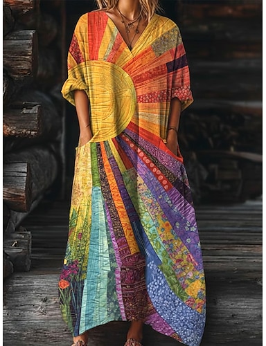 Női Maxi Ruha Vászon Szerű Shift Ruha Hétköznapi Napi Laza Fit Grafikus Geometrikus Absztrakt Hosszú Ujjú V Nyakú Kék Lila Narancs Zöld Nyár Tavasz