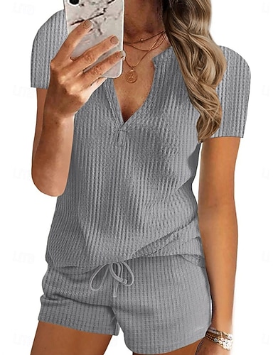 Női 2 darab divat utcai viselet napi sort szett rövid ujjú V nyak egyszínű húzózsinóros laza napi fekete fehér szürke nyár szabványos szabás