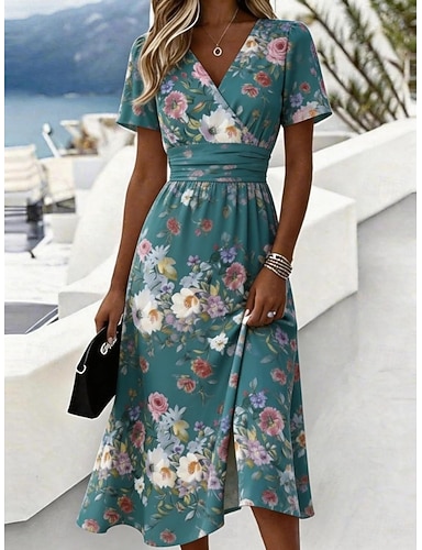 Női Midi ruha hétköznapi ruha A vonalú ruha Virágos ruha Elegáns Divat Modern Szabadtéri Vakáció Alkalmi Normál Virágos Féhosszú V-alakú Medence Arcpír rózsaszín Tengerészkék Sötétzöld Nyár Tavasz