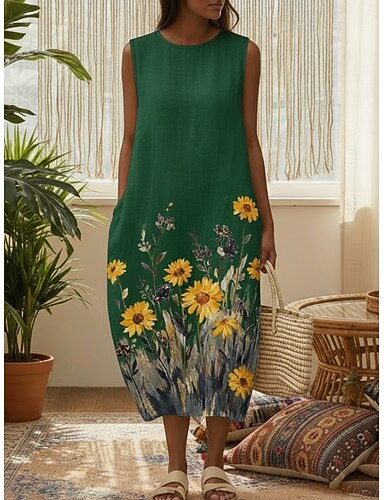 Női Midi ruha Műpamut ágynemű hétköznapi ruha Nyári ruha Váltó ruha Szüret Napi Szabadtéri Vakáció Normál Virágos Napraforgó Ujjatlan Terített nyak Medence Sárga Narancssárga Lóhere Nyár Tavasz