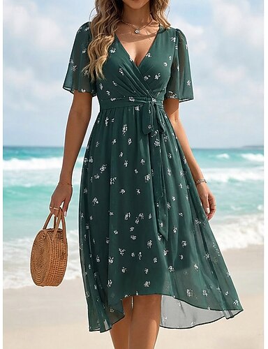 Női Midi Ruha Shift Ruha Napszoknya Virágos Zseb Mintás V Nyak Dátum Üdülés Rövid Ujjú Nyár Tavasz