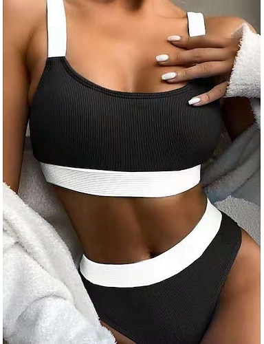 Női Bikini 2 Részes Fürdőruha Színelválasztás Magas Derék Karcsú Háton Nélküli Vakációs Tengerparti Ruházat Csíkos V Nyak Nélküli Fürdőruha