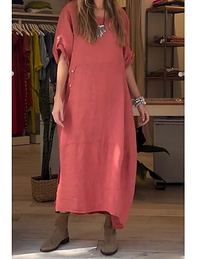 Női Maxi hosszú ruha Műpamut ágynemű hétköznapi ruha Divat Alap Modern Napi Vakáció Alkalmi Laza öltözet Sima Háromnegyedes Terített nyak Medence Arcpír rózsaszín Rubin Lóhere Tavasz Ősz