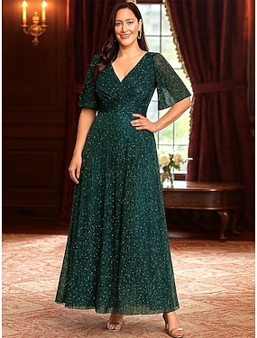 A-vonal bokalengyű esküvői vendégruha formális ruhák estélyi ruha az anyának a mennyasszonynak félhosszú ujjú V nyakú plusz méret csillogás fény szolid színben