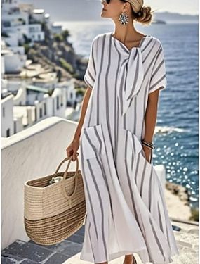 Női Maxiruha Váltó ruha nyári ruha Alkalmi Napi Laza öltözet Csíkos Rövid ujjú Terített nyak Medence Fehér Nyár