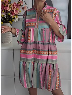 Női Mini ruha Nyári ruha Váltó ruha Fit and Flare ruha Szabadság Alkalmi Boho Napi Iroda Tengerpart Normál Grafika Mértani Hosszú ujj Magasnyakú Arcpír rózsaszín Nyár Tavasz Ősz