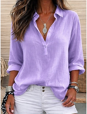 Női Pamut Vászon Blúz Gombokkal Egyszínű Stílusos Laza Hosszú Ujjú V Nyak Szabályos Felsők Mindennapi Fehér Sárga Rózsaszín Zöld Nyár Tavasz Ősz