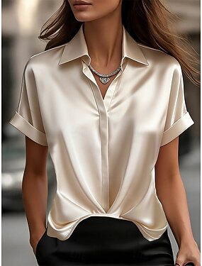 Női Szatén ing Blúz Tömör szín Elegáns Stílusos Alap Rövid ujjú Állógallér Normál felsők Hétköznapi Napi Iroda Medence Fekete Rubin Sárgabarack Nyár Tavasz