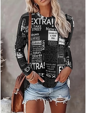 Női póló hosszú ujjal betűs hétköznapi hosszú ujjú kerek nyakú normál felsők napi hétvégi nyomtatás fekete fehér őszi téli elő-őszi