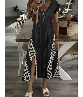 Női Midi ruha A vonalú ruha nyári ruha Alkalmi Napi Normál Grafika Mértani Rövid ujjú V-alakú Fekete Nyár Tavasz Ősz