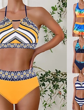 Női bikinis 2 részes fürdőruha színblokkból készült alsó rész vékony hát nélküli vakációs strandruha geometrikus színblokkal nyakpántos ujj nélküli fürdőruhához