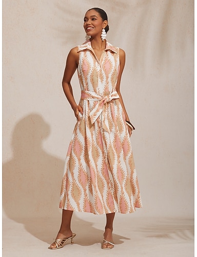 Női Ingruha Maxiruha Medence Bézs Ujjatlan Ív Zseb Nyomtatás Övvel Nyár Állógallér A-vonalú XS S M