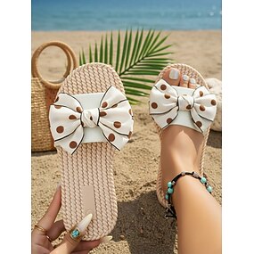 női pöttyös, masnis szandál fonott kötéltalppal – aranyos lapos talpú cipők tengerparti nyaraláshoz, nyári szünethez és medence melletti pihenéshez