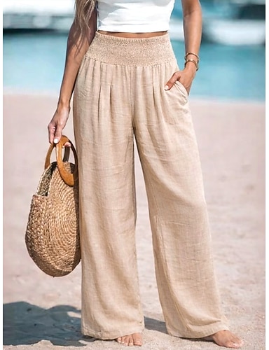 Női Műpamut ágynemű Nadrág Nyári nadrág Strand nadrág Szabadság Alap Alkalmi Teljes hossz Magas derék Sima Széles lábszár Elasztikus derékpánt Mekano Kényelmes Légáteresztő Nyúlós Tengerpart Szabadság
