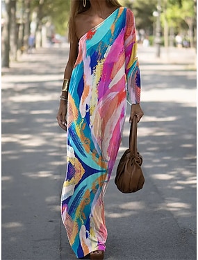 Női Hosszú ruha Maxi ruha hétköznapi ruha Nyomtatott ruha Virágos Mértani Divat Utcai sikk Szabadtéri Szabadság Alkalmi Nyomtatott Hosszú ujj Félvállas Ruha Vékony Keki zöld Medence Narancssárga Nyár