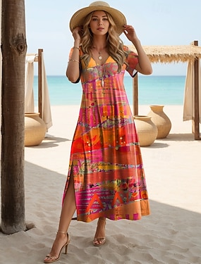 Női Maxiruha A vonalú ruha nyári ruha Szabadság Alkalmi Tengerpart Szabadság Randi Normál Grafika Mértani Rövid ujjú V-alakú Világossárga Rubin Világosbarna Narancssárga Nyár Tavasz