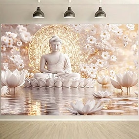 zen buddha meditáló szobor fehér lótuszvirág cseresznyevirágzás arany mandala víz tükröződés spirituális béke fali gobelin fali dekoráció meditáció hátteret jóga szoba nappali lakberendezés fal a