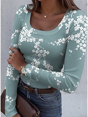 Női T-shirt Hosszú Ujjú Rugalmas Grafikai Négyzet Nyak Hosszú Ujjú Hétköznapi Virágos Klasszikus Rendszeres Felsők Napi Mintás Világos Zöld Rózsaszín Piros Kék Poros Kék Tavasz Ősz Előző Ősz