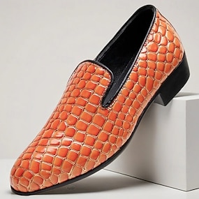 Férfi narancssárga krokodilmintás mokaszinok, bebújós műbőr felsőrésszel, merész luxus stílus, ideális divatos férfiaknak és esti eseményekre
