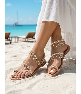 női gyöngyökkel díszített bohém lapos szandál orrhurokkal - elegáns nyári strand esküvői cipő